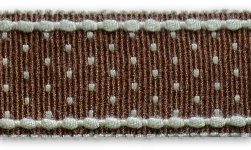 1 1/2" wide grosgrain ribbon in milk chocolate brown, with white mini-dots and braided edging.